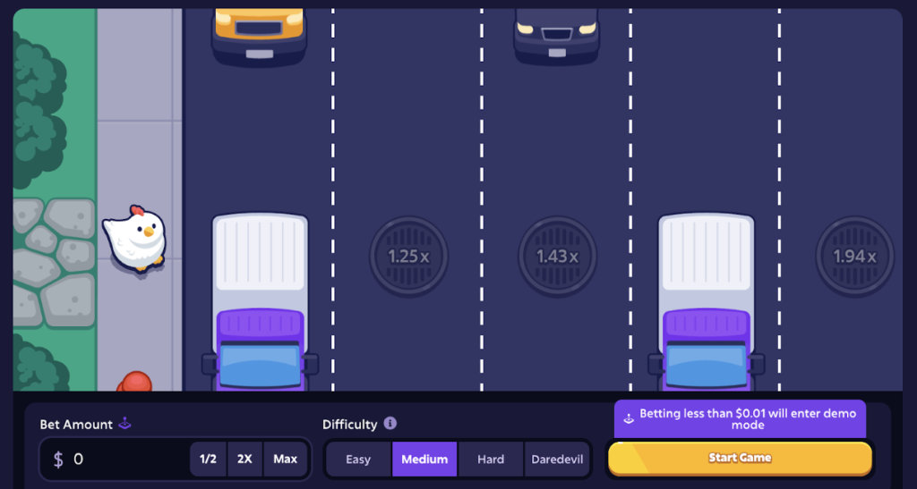 - High risk: Aim to win a payout of at least 15x on each round. Choose one of the higher difficulty levels, and try to make it to the other side of the road. This is like playing a highly volatile slot. Your wins are likely to be infrequent, but you can potentially earn large wins.