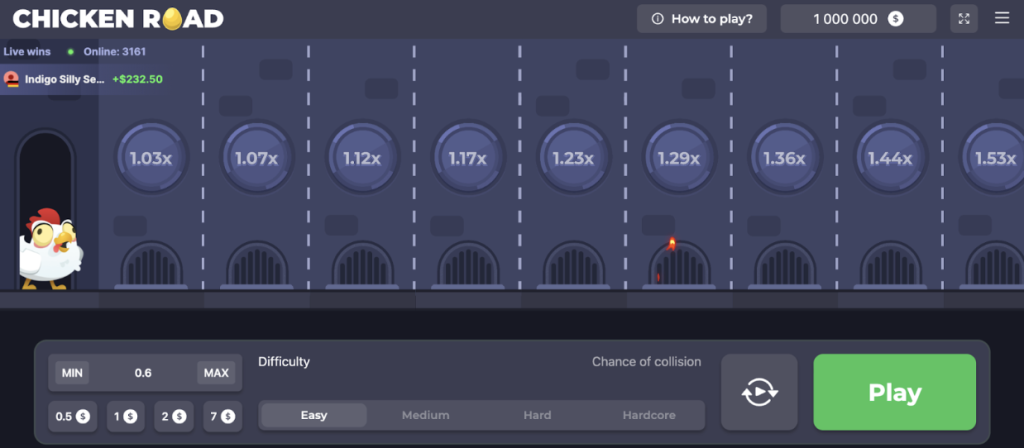 This is a simple chicken cross the road game, with a 98% return to player (RTP) rate. There are four difficulty levels: