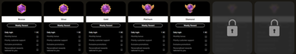 Speaking of benefits, GrandVault Casino’s seven loyalty tiers let you pick up free SC and GC through weekly rewards and extras. Beyond the 1 SC daily login bonus, higher levels unlock monthly promos, exclusive deals, priority support, and personalized rewards.