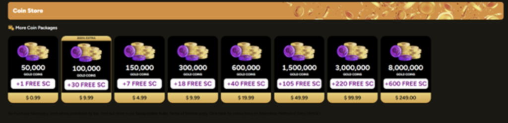 - Sweeps Coins (SC): Sweeps Coins come only through promos, either when you purchase GC or in smaller bundles tied to bonuses. They’re used on eligible games and count toward real cash redemptions (1 SC = $1) once you’ve met the 50 SC threshold.