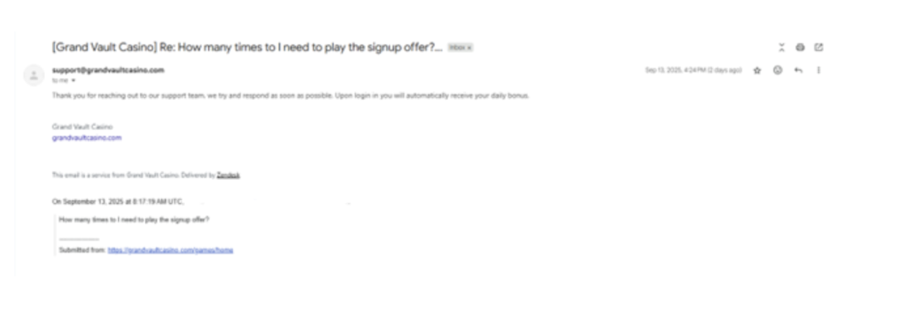 GrandVault Casino still isn’t quite where it should be when it comes to customer support. There’s no live chat available, and the little help bubble at the bottom right of the page only opens a message box tied to some sort of ticketing system. It’s not the most convenient setup. I once had an issue about which games I could or couldn’t use the bonus on, given that BGaming clause, yet no one ever replied. Later on, I asked them to confirm the playthrough requirements, and the response I got back was completely unrelated.