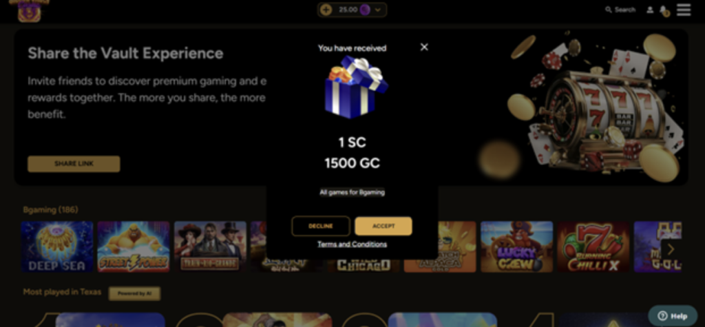 GrandVault Casino offers one of the biggest daily bonuses you’ll find at a sweepstakes site. Each day I logged in, I received 1 SC, which made it worthwhile popping in for a few seconds to collect, even if I wasn’t planning to play.