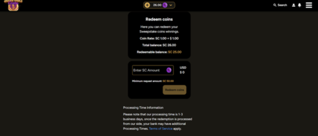 One thing I found quite interesting with the GrandVault Casino sign-up offer is that the full 2.5 SC landed in the redeemable balance straight away. I still had to play through them, though, as the minimum redemption threshold is 50 SC.